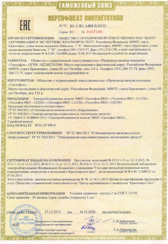 Сертификаты на инфракрасные обогреватели "Теплофон ИКО"